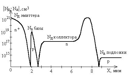 Распределение примесей приведено на рисунке 4.9. Поскольку в коллекторе основного транзистора (этот же слой является базой паразитного транзистора) распределение примеси неравномерное, то в нем создается тормозящее электрическое поле для дырок, которые движутся из эмиттера в коллектор паразитного транзистора. Кроме того, высокая концентрация примеси в коллекторе на порядок снижает распределенное сопротивление rК основного транзистора. Это исключает недостатки планарно-эпитаксиального транзистора.