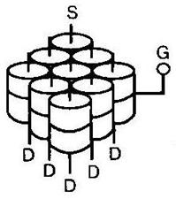 Рис. 9 Однооперационные тиристоры (SCR) занимают очень узкую нишу применения. Как правило, это высоковольтные линии электропередачи постоянного тока (ЛППТ). К концу 80-х годов предельные токи и напряжения тиристоров составляют 3000 А и 6000 В. Конкуренцию запираемым тиристорам составляют индукционные тиристоры - ИТ (SITh - Static Induction Thyristor), разработанные на базе индукционных транзисторов в Японии и имели структуру, сходную с полевыми тиристорами FCT. Преимуществом индукционных тиристоров перед GTO является: - отсутствие внутренней положительной обратной связи. Это повышает помехоустойчивость ключа и его рабочую температуру до 200°С; - малое прямое падение напряжения при относительно высоких пробивных напряжениях; - обладает положительным температурным коэффициентом; - устойчив к большим импульсным перегрузкам по току. Параметры мощного ключа составляли 1500 А и 2500 В. К серьезному недостатку прибора относится его нормальная открытость, т.е. способность проводить ток при нулевом смещении на затворе. Это требует более сложной системы управления и снижает надежность применения. Возрастающие требования экономии электроэнергии, повышения КПД систем силовой электроники, уменьшения их размеров, веса и стоимости выдвигали новые задачи по созданию высокоскоростных переключателей с минимальными потерями в широком диапазоне мощностей. Требовалась устойчивость ключевых приборов к перегрузкам по току, лавинному пробою, триггерному эффекту. Применение контроллеров в системах управления преобразователями накладывало дополнительные требования к характеристикам управляемости ключа. Принцип работы новых типов полупроводниковых ключей и его физические характеристики заключены в структуре элементарной ячейки, из множества которых он затем собирается. А мощность, которую данный ключ способен переключать, зависит от размеров активной площади кристалла, на котором реализуется его многоячейковая структура. Чем сложнее структура элементарной ячейки, тем ближе ключ по своим характеристикам к идеалу, но тем труднее реализовать эту технологию на больших размерах активной площади. Это противоречие и лежит в основе многообразия типов полупроводниковых ключей: - активная площадь кристалла ключевого прибора пропорциональна уровню предельного тока и пробивного напряжения. Этот фактор и лег в основу разделения технологий производства ключей по уровню напряжений; - второй фактор, область применения прибора в системах тех или иных электронных сетей: бортовых, однофазных, трехфазных, контактных, электропередающих. Для напряжений 50...100 В разработана технология высокочастотных МДП ключевых транзисторов. Они нашли широкое применение в преобразователях типа DC-DC для источников питания бортовых схем и устройств автомобильной электроники. Использовался метод плазменного травления. В пластине кремния создавались вертикальные канавки, заполняемые поликремнием (SiO2) используемые в качестве вертикального затвора. Этот технологический прием, получивший наименование "Trench", был применен и в более мощных транзисторах. Вертикальные канавки затвора позволили увеличить плотность размещения элементарных ячеек и снизить сопротивление открытого канала RON- Был введен параметр качества прибора - произведение сопротивления канала на площадь кристалла. Компания