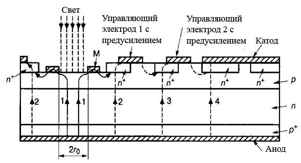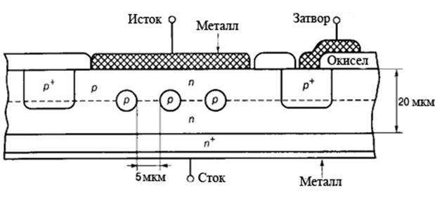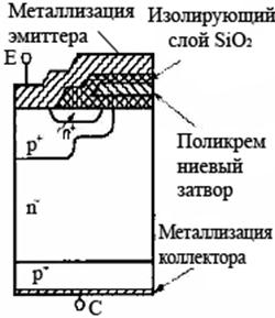 Рассмотрение структуры мощных ключевых приборов позволяет более наглядно представить принцип действия самого ключа и тех физических процессов, которые лежат в основе его работы. Схемотехническое описание базовой ячейки в виде эквивалентной электрической схемы позволяет учесть взаимное влияние полупроводникового ключа и устройства применения, сформулировать основные принципы управления данным прибором и способы его защиты. Структуры элементарных ячеек рассматриваются в виде сочетания переходов различных слоев кремниевого полупроводникового материала с электронной (п) и дырочной (р) проводимостью. Если концентрации основных носителей различаются более чем на порядок, переходы называются односторонними и обозначаются символами типа р+ -n, р-n+ и т.п., где знаки "+" и "-" указывают на высокую или, соответственно, низкую степень легирования полупроводникового слоя.