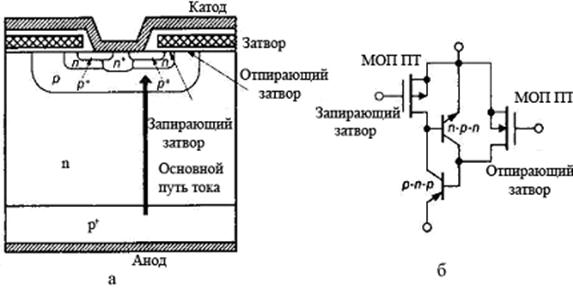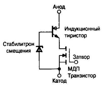 Рис. 7 Рис. 8 Другое направление представлено самосовмещенными монолитными структурами с МОП-затворами, выполненными методом двойной диффузии. Монолитные биполярно-полевые структуры изготовлены на основе вертикальной технологии ДМДП-транзисторов. В них реализовывалось совмещение функций полевого управления и биполярной проводимости. Аналогичное дискретной схеме побистора. В этих структурах наблюдался эффект потери управляемости после отпирания, эффект "защелкивания". Применение технологической шунтировки эмиттерных переходов в самосовмещенной структуре позволило подавить нежелательный триггерный эффект и создать биполярный транзистор с изолированным затвором - IGBT (Insulated Gate Bipolar Transistor). Были разработаны приборы дискретного и модульного типов на токи от десятков до сотен ампер с напряжением блокировки до 1200 В. MOS-тиристоры фирмы "Motorola" к середине 80-х годов дополняются структурами с полевым запиранием - названные МСТ (MOS Controlled Thyristor) (рис. 9), отпираются и запираются полем при очень высоких плотностях тока (> 2000 А/см2). Разработка этих приборов столкнулась с серьезной проблемой - резким снижением допустимой плотности тока с ростом числа структурообразующих элементов. Значительно больших успехов достигла технология запираемых или двухоперационных тиристоров - GTO (Gate Torn-OffThyristor). Технологические успехи 80-х годов позволяют фирмам-изготовителям почти в 100 раз повысить мощность, переключаемую GТО (до 2500 А по току и 4500 В по напряжению). В зависимости от обратного блокирующего напряжения различают структуры без шунтировки анодного перехода и с шунтировкой, а также структуры со встроенным обратным диодом. Две последние обладают меньшим остаточным напряжением. Главное применение GTO в мощных высоковольтных цепях. В середине 80-х годов на запираемых тиристорах были разработаны инверторы напряжения для двигателей электровозов. Это позволило заменить на железнодорожном транспорте двигатели постоянного тока на более экономичные двигатели переменного тока, снизить энергопотребление и повысить эффективность перевозок.