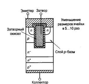 Рис. 19, а Совмещенная со структурой биполярного транзистора, эта конструкция позволила получить IGBT-прибор четвертого поколения с высокими динамическими характеристиками и напряжением открытого состояния, близким к диоду. Современные технологии развития вновь приводят нас к диоду, но уже на более совершенной ступени, где диод является управляемым по поликремневому затвору.