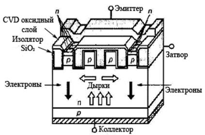 Рис. 14 Вывод. Совершенства достигли МДП-транзисторы технологии этих приборов в области относительно низких напряжений. С помощью "Trench”-технологии разработаны ячейки с ультранизким сопротивлением открытого канала. Напряжение транзисторов (OPTIMOS,) 30...75 В и ток до 80 А. Они имеют низкое сопротивление открытого канала, обладают минимальным тепловым сопротивлением (до 0.45 К/Вт) и повышенной плотностью размещения ячеек на единицу площади (1235 тысяч элементов на см2). Они обладают практически всеми свойствами идеального ключа, за исключением уровня пробивных напряжений. · Объединение отдельных дискретных транзисторов позволило разработать интегральные структуры комбинированной проводимости и получить такие приборы, как IGBT и МСТ.