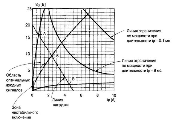 Трансформаторные ФИУ применяются в схемах управления однооперационными тиристорами [3]. Требования, предъявляемые к подобным схемам, обусловлены особенностями переключения структуры тиристора, параметрами цепи управления и нагрузкой преобразователя. Перечислим главные: 1. Для исключения локального перегрева структуры необходимо обеспечить минимально гарантированную начальную площадь включения тиристора. Это достигается подачей импульса управления с крутым фронтом нарастания тока (0.1...0.3 мкс) и минимально необходимой амплитудой, которая определяется типом тиристора (0.5...5 А). 2. Для гарантированного отпирания тиристора необходимо обеспечить минимальную длительность импульса управления (tp ~10 мкс). 3. В схемах с большой индуктивной нагрузкой, а также в выпрямительных устройствах, работающих на противонаправленных Э.Д.С., необходимо поддерживать на управляющем электроде тиристора длительные сигналы управления (до 1 мс) для обеспечения гарантированного включения. 4. Рабочая точка нагрузки управляющего электрода должна находиться в зоне оптимального управления (справочные данные) (рис. 2.21). Параметры управляющего сигнала, IG= 1...5 А и VG = 5...20 В. 5. Характеристики трансформатора должны обеспечивать изоляцию между цепями управления и силовой частью (напряжение изоляции > 2.5 кВ). 6. ФИУ должен обеспечивать помехоустойчивость тиристорных схем. Построение схемы ФИУ начинают с выбора импульсного трансформатора, (пункты 1, 2, 5).