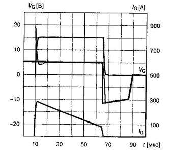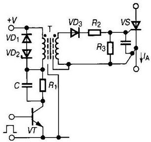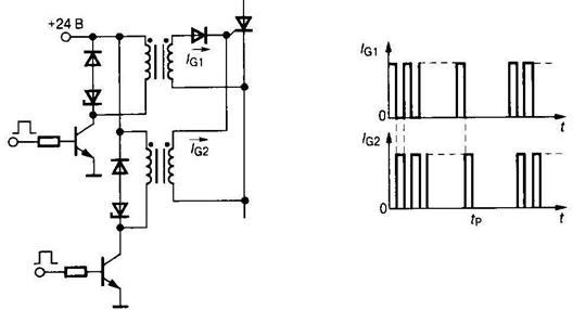 Рис. 2.21 Компания «Semikron» предлагает импульсные трансформаторы серии SKPT с параметрами: — напряжение изоляции 2.5...4 кВ; — выходное напряжение 5... 15 В; — импульсный выходной ток 0.1...1 А; — время нарастания фронта тока 0.3...5 мкс; — ширина импульса на выходе 2.5...4 кВ; — частота переключения 5... 10 кГц; — вольт-секундный показатель 330...350 В-мкс. Типовая схема трансформаторного ФИУ с ограничивающим резистором в первичной обмотке представлена на рис. 2.22. Напряжение на вторичной обмотке трансформатора определяется входной характеристикой цепи управления и прямым падением напряжения на открытом диоде. Для заданной длительности импульса управления нельзя превышать вольт-секундный показатель импульсного трансформатора. Влияние индуктивности намагничивания проявляется в уменьшении амплитуды импульса управления с течением времени. На рис. 2.23 представлены осциллограммы тока и напряжения в первичной и выходной обмотке трансформатора. В схемах с большой индуктивностью в цепи нагрузки рекомендуется использовать пакетный режим передачи импульсов, что позволяет увеличивать длительность импульса управления без насыщения трансформатора (рис. 2.24). Диод, включенный последовательно с входной цепью тиристора, поднимает порог отпирания ключа на величину напряжения смещения, что повышает помехоустойчивость схемы.