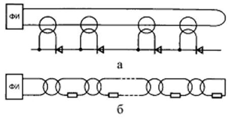 Рис. 2.26 Однако изоляция общего кабеля рассчитывается на максимальное напряжение, что увеличивает емкость связи между обмотками. В каскадном соединении трансформаторов паразитные емкости связи включаются последовательно, что обеспечивает повышение помехозащищенности ФИУ. Кроме этого, напряжение изоляции может выбираться в N раз меньше максимального анодного напряжения (где N – число последовательных ключей).