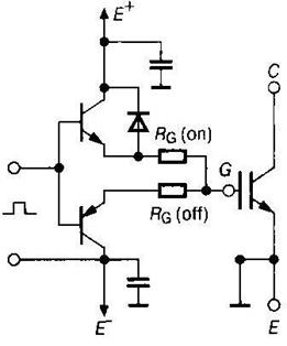 Рис. 2.32 Выходной узел драйвера, управляющего изолированным затвором, должен соответствовать следующим требованиям: 1. МДП-транзисторы и IGBT — управляются напряжением, однако для увеличения входного напряжения до 12...15 В. необходимо обеспечить в цепь затвора соответствующий заряд. 2. Динамические характеристики переключения определяются скоростью перезаряда конденсаторов транзистора. Минимальные времена обеспечиваются в режиме перезаряда постоянным динамическим током. 3. Для ограничения скорости нарастания тока в режиме малых нагрузок и уменьшения динамических помех используются последовательные сопротивления в цепях затвора. 4. Для защиты транзисторов от динамических скачков выходных напряжений используют отрицательное смещение в цепи затвора в закрытом состоянии ключа (от -2.5 до-15 В). Данным требованиям соответствует выходной узел, представленный на рис. 2.33.