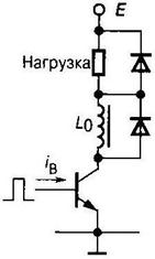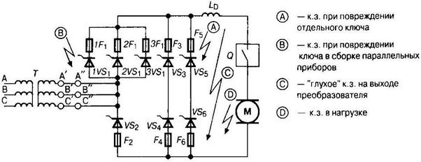 Рис. 3.1 Перегрузки по напряжению третьей группы определяются, как правило, действием нагрузок со значительной индуктивностью, что требует дополнительных элементов, шунтирующих нагрузку и обеспечивающих перевод накопленной энергии с цепью исключения всплесков напряжения (рис. 3.3). Основными видами аварийных токовых перегрузок ключей являются: 1. Короткое замыкание в силовой схеме, обусловленное повреждением какого-либо ключа или диода. 2. Короткое замыкание из-за повреждения ключа, соединенного параллельно с несколькими другими приборами. 3. Короткое замыкание на выходных клеммах преобразователя (так называемое «глухое» внешнее короткое замыкание). 4. Короткое замыкание цепи нагрузки. 5. Токовая перегрузка, связанная со сбоем в работе системы управления («опрокидывание» инвертора, короткое замыкание в плече моста и т.п.). 6. Токовая перегрузка, связанная с особенностями работы схемы и неидеальностью ключей (работа на противофазный диод, сквозные токи в схемах мостовой конфигурации). 7. Токовая перегрузка, обусловленная характером нагрузки (пусковой режим, перегрузка двигателя и т.п.). Данные режимы токовой перегрузки показаны на рис. 3.4. Во всех перечисленных случаях силовой ключ либо включается на короткозамкнутый контур, либо попадает в режим токовой перегрузки в процессе нормального открытого состояния. С точки зрения методов защиты наиболее важными являются: 1. Повышение помехозащищенности системы управления и самого силового ключа. 2. Подключение внешних защитных устройств, ограничивающих воздействие токовой перегрузки в естественных режимах коммутации (токоограничивающие цепочки и дроссели). 3. Определение момента токовой перегрузки и подключение быстродействующих систем защиты.