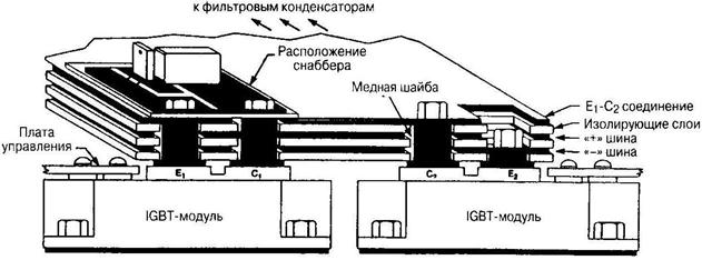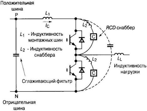 Рис. 3.6 Для данной индуктивности величина запасаемой энергии увеличивается более чем в 300 раз: 0.5Ls IF2≈158Bт. Столь значительное увеличение паразитной энергии требует как можно большего снижения величины Ls. В Табл. 3.1 приводятся значения допустимых величин паразитных индуктивностей силовых шин LS1, а также паразитных индуктивностей дополнительных защитных цепочек (снабберов) LS2 в зависимости от величины нагрузочного тока (рис. 3.6). Уменьшение паразитных индуктивностей достигается применением специальных проводников и конструкций монтажных соединений. В качестве проводящих соединений рекомендуется использовать на токи менее 100 А многожильные проводники, которые позволяют выполнить монтаж основных узлов силовой схемы с уменьшением электромагнитных помех, генерируемых в процессе работы схемы. Основной принцип данного монтажа заключается в том, что соединение всех элементов, в которых удается выделить контур втекания и вытекания тока, осуществляется скрученными парами проводников, например, как это показано на рис. 3.7. При более высоких уровнях тока используют проводники в виде металлических пластин (на токи 150...300 А) или специальные монтажные платы, проводящие слои которых разделены слоями изолирующих материалов (пластмассовые пластины). Чтобы выполнить данные соединения с минимальной длиной и индуктивностью, фильтрующие конденсаторы рекомендуется размещать непосредственно над модулями силовых ключей (рис. 3.8). После проведения монтажа силовой части схемы с минимальными паразитными индуктивностями осуществляют доработку конструкции на предмет уменьшения влияния помех на каналы информационных сигналов, подходящие к полупроводниковым ключам. С этой целью разделяют гальваническую связь между драйверами силовых ключей и основными токоведущими шинами схемы, уменьшают индуктивную связь между проводниками, а также емкостную связь между цепями, относящимися к различным частям преобразователя. Рассмотрим данные рекомендации на практических примерах.