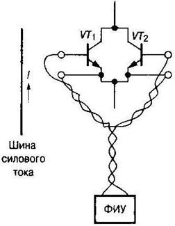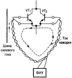 При невозможности подключения драйвера прямо к входу ключа используют витые пары проводников, однако их длина не должна превышать 5...7 см. При использовании ключей модульной конструкции следует избегать индуктивных наводок в контуре, образованном между общей точкой ключа и драйвера, как это показано на рис. 3.12. Уменьшения влияния индуктивных наводок можно добиться минимизацией площадей соединительных контуров (рис. 3.13). Аналогичные методы применяются к соединительным цепям между преобразователем и нагрузкой, при которых минимизируется площадь контуров связи. Поскольку драйвер располагается рядом с силовым ключом, необходимо грамотно провести соединение между удаленной логической схемой управления и входной схемой драйвера.