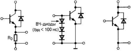 а б Рис. 3.44 Амплитуда токовой перегрузки в режиме короткого замыкания IGBT типа СМ100DY-12E составила 650 А. Отключение аварийного тока произведено в течение времени менее 4 мкс при относительно небольшом всплеске в выходной цепи ключа (несколько десятков вольт). Драйверы, предназначенные для управления силовыми ключами в мостовых схемах, осуществляют также контроль за временем перекрытия при совместной работе приборов одного плеча, что эквивалентно режиму короткого замыкания. Реализация данной функции показана на рис. 3.45. Следует заметить, что время задержки подачи импульса управления на очередной ключ можно также изменить подключением дополнительного резистора к специальным выводам драйвера.