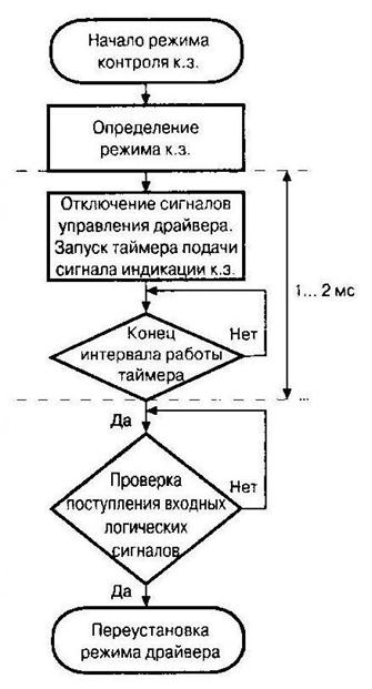 Рис. 3.40 Более полное представление о работе системы в режиме короткого замыкания позволяет получить алгоритм взаимодействия структурных частей схемы, показанный на рис. 3.41. Дадим краткие пояснения к основным блокам алгоритма: 1. Начало контроля режима токовой перегрузки. Для правильной организации режима контроля предварительно необходимо настроить систему по уровню срабатывания защиты и времени задержки до начала контроля. Некоторые драйверы допускают регулировку уровня срабатывания защиты, если они предназначены для использования с силовыми ключами, имеющими разное напряжение насыщения. Время задержки начала контроля необходимо для установления параметров драйвера при пусковых режимах, а также для полного установления напряжения на открытом ключе в переходном процессе включения (рис. 3.42). Изменение параметров защиты осуществляется внешними дополнительными элементами (резисторы конденсаторы), подключаемыми к специальным выводам драйвера. 2. Определение режима перегрузки. Функции данного блока уже были рассмотрены ранее (см. рис. 3.37). 3. Плавное отключение входного сигнала. Запуск таймера и индикация режима перегрузки. Запуск таймера производится на относительно большой интервал времени 1...2 мс, в течение которого должны сработать все остальные системы защиты, если аварийная перегрузка действительно носит серьезный характер. Индикация режима перегрузки осуществляется подключением внешней цепи, как правило, на основе оптопар. Работа данного блока защиты демонстрируется на рис. 3.43.