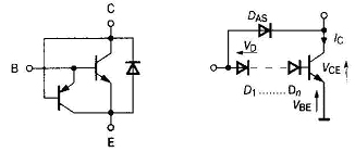 Одной из основных тенденций развития современных силовых ключей, основанной на достижениях монолитной и гибридной технологий, является объединение в едином корпусе прибора функций переключателя, его управления и защиты. Данные приборы, получившие название «разумные» (Smart) или интеллектуальные (Intelligent), позволяют избавиться от громоздких и неэкономичных дополнительных цепей защиты, среди уже достаточно широкого перечня подобных приборов можно выделить следующие основные группы: 1. Силовые ключи с одной или несколькими встроенными системами защиты. Для управления данными приборами требуется применение внешнего драйвера. Эти ключи, называемые также самозащищенными, обеспечивают защиту от перенапряжений, токовых-перегрузок и температурных воздействий. 2. Силовые ключи с интегрированными функциями защиты и управления. Данные приборы получили название силовых интегральных схем (Power Integrated Circuits) и, как правило, разрабатываются для конкретной области применения, например в ключевых источниках электропитания, или схемах управления электродвигателями на мощности до единиц киловатт. 3. Силовые интеллектуальные модули IPM (Intelligent Power Modules.). Данные схемы строятся на базе IGBT-ключей для применения в преобразователях на десятки и сотни киловатт мощности нагрузки. Детальное рассмотрение всех функций и возможностей этих интересных и перспективных приборов может составить отдельную книгу, поэтому остановимся только на основных моментах, относящихся к защитным свойствам «разумных» ключей. Одним из главных недостатков биполярных транзисторов является необходимость удаления избыточного накопленного заряда при выключении, Это сопровождается увеличением временного параметра, называемого временем рассасывания. При достаточно глубоком насыщении ключа время рассасывания может увеличиваться до единиц, а то и десятков микросекунд. Это не только ухудшает динамические свойства транзистора, но и может приводить к режимам перегрузки, например, в схемах мостовой конфигурации. Для решения проблемы используют цепи нелинейной обратной связи, что существенно усложняет схемотехнику устройства (как минимум четыре дополнительных диода на ключ), или применяют систему пропорционального токового управления, что дополнительно нагружает систему формирователя импульсов. В серии транзисторов PowerLux-D2 фирмы «ON-Semiconductor» данная проблема решена на интегральном уровне. Если в многоячейковой структуре биполярного транзистора (см. главу 2) диффузию верхнего эмиттерного слоя проводить только в каждой второй ячейке, получится прибор, эквивалентная схема которого показана на рис. 3.46. Данная схема представляет собой ненасыщенный ключ, в котором при начале положительного смещения в цепи коллекторного перехода открывается регулирующий транзистор, автоматически отводящий избыток базового тока управления. На базе рассмотренных ранее SENSE-структур силовых транзисторов создаются ключи с защитой от токовой перегрузки.