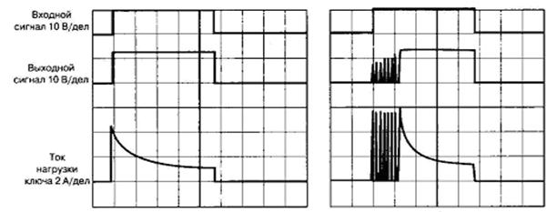 Рис. 3.47 Рис. 3.48 В режиме короткого замыкания МДП-ключ автоматически выключается, если длительность перегрузки превышает 40 мкс. Температурный датчик также обеспечивает выключение драйвера при увеличении перегрева структуры свыше 150°С. Диаграмма, иллюстрирующая работу систем защиты при токовой и температурной перегрузке, представлена на рис. 3.53.