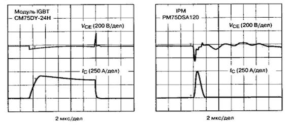 По сигналу перегрузки от любой из перечисленных систем защиты драйвер прерывает подачу импульсов управления во входную цепь IGBT, При этом на выходе системы индикации режима перегрузки появляется информационный сигнал. В IPM третьего поколения применяется ускоренная система контроля режима токовой перегрузки, которая позволяет обнаружить аварийный процесс в течение интервала менее 100 нс. На рис. 3.57 показаны осциллограммы, иллюстрирующие прерывание тока короткого замыкания при использовании стандартного драйвера с функцией токовой защиты и при работе системы защиты IPM. Ускоренный режим обнаружения и отключения токовой перегрузки практически не сопровождается выбросами перенапряжений в схеме ключа.