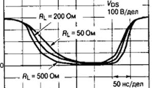 При этом усиливается эффект обратной связи (эффект Миллера) и спад напряжения VDS замедляется (рис. 4.19). Вторая стадия заканчивается, когда напряжение VGS достигает напряжения смыкания VCM. На последнем этапе включения VGS изменяется от VCM до нуля, при этом ток стока определяется ВАХ открытого транзистора. В переходном процессе выключения при малых значениях RIN СИТ закрывается достаточно быстро, а время выключения определяется постоянной RLCGD. По этой причине стадия запирания существенно меньше времени включения и увеличивается с ростом нагрузки.