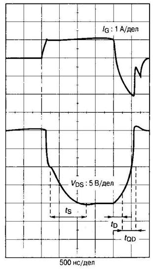 Остановимся на зависимости временных параметров переключения в биполярном режиме оттоков нагрузки и управления (рис. 4.21). Наиболее сильной является зависимость времени рассасывания tD как от степени насыщения (тока нагрузки), так и от условий запирания (отрицательного тока затвора). Длительность фронтов переключения tR и tF изменяется незначительно в пределах 20...50 нc, поскольку определяется главным образом полевыми эффектами в структуре. При данных скоростях изменения тока следует особое внимание обращать на паразитные индуктивности схемы, которые не должны превышать значения 100...150 нГн.