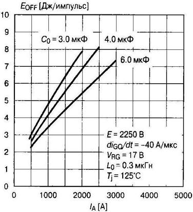 Рис. 4.40 3. Поскольку использование GTO предполагает применение защитных RС-цепей, энергия потерь при выключении EOFF задается как функция тока нагрузки с использованием в качестве параметра величины емкости демпфирующего конденсатора (рис. 4.41). Увеличение емкости вызывает уменьшение энергии потерь, поскольку фронт нарастания анодного напряжения становится более медленным.