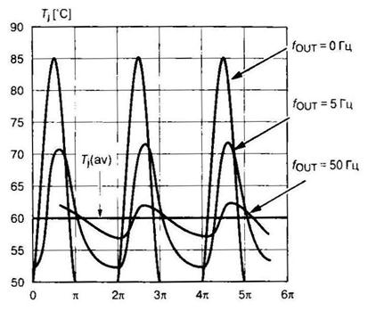 где Orr, Irr, trr — динамические характеристики диода. Оценка реальных потерь в схемах преобразователей для асинхронных двигателей показывает, что при относительно невысокой частоте коммутации основную долю составляют потери мощности в открытом состоянии ключа и диода, которые в свою очередь зависят от максимального тока нагрузки, напряжения насыщения, а также произведения A = (m cosφ), учитывающего эффективность преобразователя по напряжению (m) и характер нагрузки (cos φ). При регулировании скорости двигателя с изменением частоты и амплитуды выходного сигнала параметр А также изменяется. Максимум мощности потерь в ключе определяется при А→1. Рабочий цикл силового ключа при этом максимален, а увеличение коэффициента мощности означает сближение максимумов открытого состояния tP и тока нагрузки. Максимальные потери в диоде возникают при отрицательных коэффициентах мощности (cosφ < 0), при этом преобразователь представляет собой источник с реверсированной мощностью. На рис. 4.74 представлено изменение мгновенной мощности потерь и ее среднее значение для отдельного IGBT-ключа трехфазного мостового модуля BSM50GD120DN2 в корпусе Econopack 2 фирмы «Infineon Technologies», предназначенного для применения в диапазоне 50 А 1200 В. Параметры схемы преобразователя и режима нагрузки: Напряжение питания инвертора Е = 540 В. Действующее значение тока нагрузки /L (действ) = 25 А. Частота коммутации f=4kHz. Коэффициент мощности cos f = 0.8. Коэффициент модуляции m = 0.8. Изменение температуры кристалла ключа с учетом тепловых сопротивлений и мощности потерь представлено на рис. 4.75 для нескольких частот выходного напряжения. Анализ полученных данных позволяет сделать следующие выводы: 1. С ростом частоты fOUT максимальная температура перехода приближается к среднему значению, что позволяет на частотах в несколько десятков герц оценивать тепловой режим ключа на основе средних потерь. 2. Максимальная температура ключа резко возрастает при уменьшении tOUT до единиц герц, что соответствует величине частоты скольжения асинхронного двигателя. Запуск электродвигателя также требует использования низких частот при большом вращающем моменте, который сопровождается увеличением тока нагрузки, что определяет наихудшие условия теплового режима ключа. Приведенные данные показывают, что относительно сложные законы управления с различными вариантами ШИМ, позволяющие получать (Качественные характеристики преобразователя, могут быть реализованы на основе полностью управляемых ключей, имеющих минимальное напряжение насыщения и способных выдерживать большие токовые перегрузки. Мощные МДП-транзисторы могут рассматриваться в качестве конкурентоспособных ключей для данной сферы применения только при относительно низких напряжениях (менее 200 В). Наиболее предпочтительными в системах управления двигателями переменного тока являются транзисторы IGBT и тиристорные ключи. Выбор конкретного типа ключа определяется сферой применения асинхронного двигателя, которые различаются уровнем токовой нагрузки.