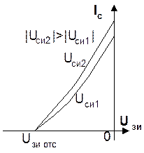 Рис 1.7.3.1. Семейство выходных статических характеристик полевого транзистора и статические характеристики передачи полевого транзистора с управляющим p-n -переходом и n -каналом При фиксированном значении напряжения При некотором значении напряжения сток-исток, получившим название напряжения насыщения Очевидно, что наибольшее значение тока стока будет при нулевом напряжении затвор-исток. Чем больше абсолютное значение напряжения затвор-исток тем меньше начальное поперечное сечение канала, и, следовательно, выше его сопротивление. При больших значениях напряжения сток-исток может возникнуть электрический пробой обратно смещенного перехода затвор-исток. Пробой электронно-дырочных переходов кремниевых полевых транзисторов носит лавинный характер. Статические характеристики передачи представляют зависимость тока насыщения стока от напряжения на затворе при постоянном напряжении на стоке. Основным рабочим режимом полевых транзисторов с управляющим p-n -переходом является режим насыщения тока стока. Статические характеристики передачи дают возможность определить один из основных параметров транзистора, характеризующий его усилительные свойства - крутизну характеристики: