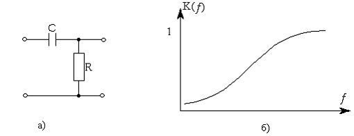 В RC -фильтре верхних частот (ФВЧ) конденсатор включён в продольное плечо (рис. 2. 4.8. а). Поэтому на низких частотах его сопротивление значительно больше сопротивление резистора параллельного плеча и коэффициент передачи мал. С увеличением частоты сопротивление конденсатора уменьшается, что приводит к увеличению коэффициента передачи (рис. 2.4.8. б).