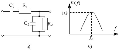 Рис. 2. 4.8. Схема пассивного RC- фильтра верхних частот (а) и его АЧХ (б). Рассмотренные ФНЧ и ФВЧ, состоящие из нескольких однотипных звеньев RC, называются цепочечными RC -фильтрами. В качестве полосового RC -фильтра на низких частотах применяется Г -образный RC -фильтр (рис. 2.4.9. а).