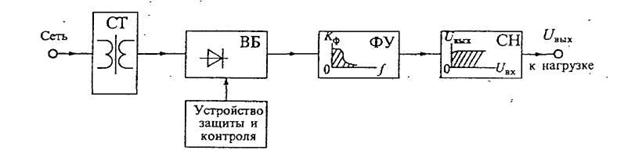 Выпрямителем называется устройство, предназначенное для преобразования переменного напряжения в постоянное. Основное назначение выпрямителя заключается в сохранении направления тока в нагрузке при изменении полярности приложенного напряжения. Выпрямитель можно рассматривать как один из типов инверторов напряжения. Обобщенная структурная схема выпрямителя приведена на рис. 2.5.1.