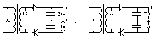 Рис. 2.5.7. Принципиальная схема и осциллограммы напряжения в различных точках выпрямителя с удвоением напряжения. На рисунке 2.5.7.: U2 - Напряжение вторичной обмотки трансформатора Uн – Напряжение на нагрузке. Отличительной особенностью данной схемы является то, что в одном полупериоде переменного напряжения от вторичной обмотки трансформатора “заряжается” один конденсатор, а во втором полупериоде от той же обмотки– другой. Поскольку конденсаторы включены последовательно, то результирующее напряжение на обоих конденсаторах (на нагрузке) в два раза выше, чем можно получить от той же вторичной обмотки в схеме с однополупериодным выпрямителем. Преимущества: вторичную обмотку трансформатора можно рассчитывать на значительно меньшее напряжение. Недостатки: значительные токи через вентили выпрямителя, Уровень пульсаций значительно выше, чем в схемах двухполупериодных выпрямителей. Эта же схема может использоваться еще в двух вариантах, рисунок 2.5,8: