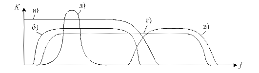 Рис.3.1.2. АЧХ: а) УПТ, б) УНЧ, в) УВЧ, г) ШПУ, д) ИУ По виду усиливаемого сигнала усилители делятся на усилители гармонических и импульсных сигналов. Усилители гармонических сигналов предназначены для усиления сигналов, изменение которых происходит много медленнее длительностей переходных процессов в самих усилителях. Усилители импульсных сигналов предназначены для импульсных периодических и непериодических сигналов. При этом длительность собственных переходных процессов в усилителе не должна вызывать искажений исходной формы усиливаемых сигналов. По виду усиливаемого параметра сигнала усилители делятся на усилители напряжения, тока и мощности в зависимости от того, какой из параметров требуется усиливать. По виду соединительных цепей усилительных каскадов можно предложить следующую классификацию. Так как усилители строятся, как правило, на основе последовательного включения нескольких типовых каскадов, то различают усилители с гальванической (непосредственной) связью, предусматривающие передачу между каскадами сигнала как переменного, так и постоянного токов; усилители с RC – связями, в которых между выходом предыдущего и входом последующего каскадов включают резистивно-емкостную связь, исключающую передачу сигналов постоянного тока; усилители с индуктивной (трансформаторной) связью, в которых между каскадами включается трансформатор. Совокупность усилительного элемента с нагрузкой и со всеми дополнительными элементами, обеспечивающими заданный режим работы, называют каскадом усиления. Общее усиление, которое требуется получить от усилителя, во многих случаях гораздо больше того, которое может обеспечить один каскад. Отсюда вытекает необходимость включения нескольких каскадов для получения нужного усиления. Таким образом, усилительное устройство состоит из определенного числа каскадов. При этом выходной усиленный сигнал предыдущего каскада становится входным сигналом последующего каскада и получает дополнительное усиление. Общее число каскадов усилителя определяется требуемым коэффициентом усиления и тем, какое усиление может дать каждый каскад. Источник сигнала (например, микрофон, детектор приемника или воспроизводящая головка магнитофона, передающая телевизионная трубка, приемная антенна, кабельная линия и т.д.) подключается к входу первого каскада. Потребитель усиленного сигнала, т.е. нагрузка (ею может быть громкоговоритель, кабельная линия, кинескоп, измерительный прибор и т.д.), подключается к выходу последнего каскада, который называют выходным, или оконечным, каскадом. Все каскады до выходного называют каскадами предварительного усиления. Задача оконечного (выходного) каскада – отдать в нагрузку заданные мощность или напряжение. Задача предварительных каскадов – усилить входной сигнал источника до уровня, который необходимо подать на вход оконечного каскада, чтобы получить на его выходе заданные мощность или напряжение. Каждый каскад характеризуется своими входными и выходными сопротивления ми. Входное сопротивление следующего каскада включено параллельно выходному сопротивлению предыдущего каскада. В том случае, если следующий каскад усиления собран на полевом транзисторе или на электронной лампе, работающими без входных токов и имеющими очень большое входное сопротивле