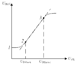 Рис.3.2.2. Амплитудная характеристика усилителя Динамический диапазон усиления характеризует диапазон изменения входного сигнала: D = UВХ макс / UВХмин Переходная характеристика усилителя – это зависимость выходного сигнала (тока, напряжения) от времени при скачкообразном входном воздействии (рис.3.2.3). Эта характеристика используется для определения динамических свойств устройства. Численно по данной характеристике определяют два параметра: время нарастания выходного напряжения tНАР и перерегулирование выходного напряжения (выброс фронта импульса) δ. Частотная, фазовая и переходная характеристики усилителя однозначно связаны друг с другом. Области верхних частот соответствует переходная характеристика в области малых времен, области низких частот – переходная характеристика в области больших времен.