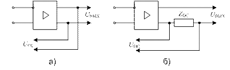 Рис. 3.4.2. Обратная связью по напряжению (а) и по току (б) По способу введения сигнала обратной связи различают: последовательную схему введения ОС (рис. 3.4.3, а), когда напряжение сигнала ОС суммируется со входным напряжением; параллельную схему введения ОС (рис. 3.4.3, б), когда ток цепи ОС суммируется с током входного сигнала.