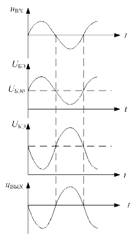 Рис.3.7.3. Временные диаграммы работы транзисторного усилителя в схеме с ОЭ Начальное положение рабочей точки обеспечивается делителем напряжения, состоящим из резисторов R1 и R2, значения сопротивлений которых определяют из соотношений: R1 = (EK – UБЭ0 – URЭ) / (IД + IБ0); R2 = (UБЭ0 + URЭ) / IД, где IД = (2÷5) IБ0 – ток в цепи делителя. При обеспечении режима работы транзистора необходимо осуществить температурную стабилизацию положения рабочей точки (уменьшить влияние температуры на начальное положение рабочей точки). С этой целью в эмиттерную цепь введен резистор R Э, на котором создается напряжение ООС по постоянному току UR Э.