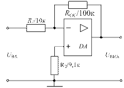 Рис.12.1. Инвертирующий усилитель на ОУ Анализируя эту схему с учетом сформулированных выше правил, можно показать, что при заземленном неинвертирующем входе ОУ напряжение на инвертирующем входе также равно нулю. Это означает, что падение напряжения на резисторе RОС равно U ВЫХ, а падение напряжения на резисторе R1 равно UВХ. Если входные токи ОУ равны нулю, то UВЫХ / RОС = –UВХ / R1, коэффициент усиления по напряжению КU = UВЫХ / UВХ = –RОС / R1. Знак «минус» показывает, что выходной сигнал инвертирован относительно входного (сдвинут на 180º). Данная схема является усилителем постоянного тока, АЧХ ее представлена на рис.9.9. В этой схеме реализована параллельная ООС по напряжению, поскольку сигнал ООС оказывается включенным не последовательно с входным сигналом, а подается параллельно с ним на один и тот же вход. Как известно, параллельная ООС уменьшает входное сопротивление усилителя. В схеме потенциал точки соединения R1 и RОС всегда равен нулю, а эта точка называется «виртуальный ноль» (мнимая земля). Следовательно, входное сопротивление схемы RВХ = R1. Выходное сопротивление схемы мало и равно долям ома. Таким образом, недостатком схемы является малое входное сопротивление, особенно для усилителей с большим коэффициентом усиления по напряжению, в которых резистор R1, как правило, бывает небольшим. Достоинством схемы является малое значение синфазного напряжения, практически равного нулю. Тот факт, что коэффициент усиления определяется всего лишь соотношением двух сопротивлений, делает применение инвертирующего усилителя очень гибким. Практическое использование усилителей на ОУ имеет ряд особенностей. ОУ должен находиться в активном режиме, его входы и выходы не должны быть перегружены. Например, если подать на вход усилителя чересчур большой сигнал, то это приведет к тому, что выходной сигнал станет равным напряжению насыщения (обычно его величина меньше напряжения питания на 2 В). В схеме ОУ обязательно должны быть предусмотрена цепь обратной связи по постоянному току, в противном случае ОУ обязательно попадет в режим насыщения. Многие ОУ имеют довольно малое предельно допустимое дифференциальное входное напряжение. Максимальная разность напряжений между инвертирующим и неинвертирующим входами может быть ограничена величиной 5 В для любой полярности напряжения. Если пренебречь этим условием, то возникнут большие входные токи. Из-за наличия входного напряжения смещения, при нулевом напряжении на входе напряжение на выходе равно: UВЫХ=KUUСМ.. Для усилителя, имеющего коэффициент усиления, равный 100 и входное напряжение смещения 2 мВ, выходное напряжение смещения может достигать значения ±0,2 В. Для решения этой проблемы нужно использовать цепи внешней коррекции нуля (используя ОУ с такими возможностями), выбирать ОУ с малым значением смещения. Если усиление постоянного тока не нужно, то можно использовать разделительные емкости в последовательной цепи передачи входного и выходного сигнала. Если в инвертирующем усилителе один из входов заземлен, то даже при условии идеальной настройки (UСМ = 0), на выходе усилителя будет присутствовать отличное от нуля выходное напряжение. Это связано с тем, что входной ток смещения IВХ создает падение напряжения на резисторах, которое затем усиливается схемой усилителя. В этой схеме сопротивление со 