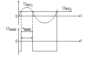весьма мало. В идеале Кu →∞ и Uгр→0. Реально в ИМС Uгр не более нескольких милливольт. Т.е. можно сделать вывод, что на линейном участке Uвх1-Uвх2 таким образом, получаем, что при Uвх1-Uвх2>0 (т.е. Uвх1>Uвх2) Uвых=+Uвыхmax , а при Uвх1-Uвх2<0 Uвых=-Uвыхmax . Выходное напряжение ОУ при |Uвх1-Uвх2|>Uгр зависит от того, какое из входных напряжений больше. Или иными словами ОУ является в этом случае схемой сравнения (компаратором). Если положить Uвх2=const, Uвх1=Usinώt, то работа ОУ в режиме компаратора иллюстрируется с помощью рисунке 4.2.4. Компаратор переключается в моменты равенства Uвх1=Uвх2 и напряжение на выходе имеет форму прямоугольных импульсов. Естественно, что при постоянной амплитуде и частоте синусоиды длительность импульсов зависит от величины Uвх2 , играющего роль опорного напряжения.