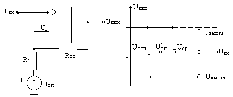 a) б) Рис.4.2.5. а) Компаратор, с ОУ охваченным ПОС (триггер Шмитта); б) Симметричная относительно оси ординат передаточная характеристика компаратора. Расчет Uср и Uотп производится при Uо=0, т.е. в момент сравнения сигналов по обоим входам, а именно: