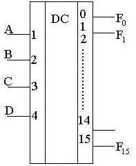 Рис. 5.4.1. Обозначение дешифратора Таблица истинности дешифратора с четырьмя входами А, В, С, D приведена в таблице 5.4.1. Число выходов N=2n=16 – это максимальное значение при n= 4, бывает, что N= 10, 12. Сам дешифратор показан на рис.5. 4.1. Дешифратор реализует следующие логические функции: