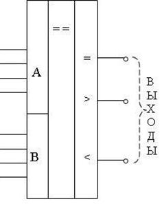 Рис. 5.4.7. Обозначение полусумматора Цифровые схемы сравнения – устройства, которые формируют на соответствующих выходах "1" в зависимости от результатов сравнения двух чисел. Обозначение показано на рис. 5.4.8. На рис. 5.4.9. приведена схема сравнения, выполненная на базе многоразрядного сумматора и схемы " И ".