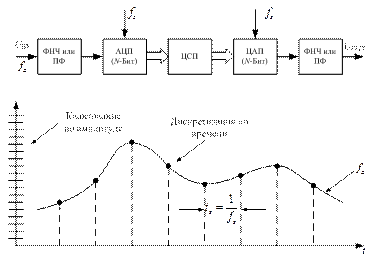 В системах управления различными объектами и процессами, при измерении физических величин первичная информация, получаемая от различных датчиков, как правило, поступает в аналоговой форме. Эту информацию в дальнейшем необходимо обрабатывать в соответствии с заданным алгоритмом. Обработка аналоговых сигналов, хранение, передача, отображение представляет определенные трудности и осуществляется с большой погрешностью. Обработку этой информации удобнее вести в цифровой форме. Процессы, происходящие в обычных аналоговых электронных схемах, можно рассматривать как результат математических вычислений. Например, усиление можно считать умножением на константу, смешивание сигналов – сложением, а ослабление в делителе напряжения – делением на константу, модуляцию – умножением двух чисел. Для фильтрации сигналов можно использовать цифровые фильтры. В будущем обработка сигналов, их передача и регистрация в большинстве случаев будет осуществляться цифровыми методами. Достоинством цифровой обработки сигналов являются абсолютная повторяемость, свободная от влияния случайных изменений параметров, их разброса, легкость цифрового управления и запоминание всех функций. Возможность свободно манипулировать сигналами во времени обеспечивает реализацию такой обработки, которая слишком дорога или невозможна в аналоговом исполнении, например, гребенчатые фильтры. Представление результатов цифровой обработки сигналов в большинстве случаев требует представления в аналоговой форме. В качестве примера можно привести воспроизведение музыки с компакт-дисков. Любая система, использующая цифровую обработку сигналов, предполагает преобразование сигналов из аналогового вида в цифровой и затем, после обработки, из цифрового в аналоговый вид. Для этих целей применяются аналого-цифровые (АЦП) и цифро-аналоговые преобразователи (ЦАП). Аналого-цифровые преобразователи представляют собой устройства, предназначенные для преобразования электрических величин (напряжения, тока, сопротивления, емкости) в цифровой код. Наиболее часто входной величиной является напряжение. Цифро-аналоговые преобразователи предназначены для преобразования числа, представленного, как правило, в виде двоичного кода, в напряжение или ток, пропорциональные этому числу. Функциональная схема типичной аналого-цифровой системы, содержащей цифровой сигнальный процессор (ЦСП), представлена на рис. 5.7.1. Обычно, прежде чем подвергнуться аналого-цифровому преобразованию, аналоговый сигнал проходит через цепи нормализации, которые выполняют такие функции, как усиление или ослабление и фильтрация. Для подавления нежелательных сигналов вне полосы пропускания и предотвращения наложения спектров необходим фильтр низких частот или полосовой фильтр. Схема работает в реальном масштабе времени. В ней АЦП непрерывно дискретизирует сигнал с частотой, равной ƒД, и выдает новый отсчет процессору ЦСП с той же частотой. Для обеспечения работы в реальном масштабе времени ЦСП должен закончить все вычисления в пределах интервала дискретизации 1/ƒД и передать выходной отсчет на ЦАП до поступления следующего отсчета с АЦП.