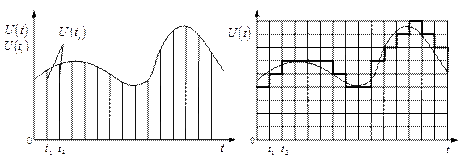 Процедура аналого-цифрового преобразования непрерывного сигнала представляет собой преобразование непрерывной функции напряжения U(t) в последовательность чисел U(tn), где n = 0, 1, 2 …, отнесенных к некоторым фиксированным моментам времени. При дискретизации непрерывная функция U(t) преобразуется в последовательность ее отсчетов U(tn), как показано на рис. 5.7.3, а).
