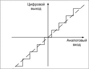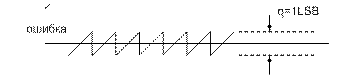 Рис. 5.7.6. Апертурная погрешность Наличие апертурной погрешности приводит к тому, что дискретизация с помощью самого АЦП вызывает существенное расхождение требований между быстродействием АЦП и периодом дискретизации. Таким образом, даже для сравнительно узкополосных сигналов требуется быстродействующий АЦП. Частично эту проблему решают с помощью устройств выборки-хранения (УВХ), имеющих малое апертурное время. Два десятилетия назад схемы дискретизации АЦП создавались отдельно из УВХ и АЦП. Проектирование интерфейса было трудным делом, и главная причина этого заключалась в дрожании апертуры в УВХ. Сегодня большинство АЦП имеют встроенные УВХ, что значительно улучшает их характеристики. Процесс квантования аналогового сигнала представляет собой необратимое преобразование и сопровождается появлением погрешностей. Цифровое представление сигнала всегда дискретно, число его возможных состояний определяется разрешающей способностью, т.е. разрядностью АЦП. Разность между двумя соседними значениями квантованной величины называется шагом квантования h. Характеристика преобразования аналоговой величины в квантованную показана на рис. 5.7.7., а). Максимальная погрешность, которую имеет АЦП при квантовании входного сигнала, равна ± 0,5 h (рис. 5.7.7., б)). Любой аналоговый сигнал, поступающий на вход идеального N -разрядного АЦП, производит шум квантования. Среднеквадратическое значение шума приблизительно равно весу h /