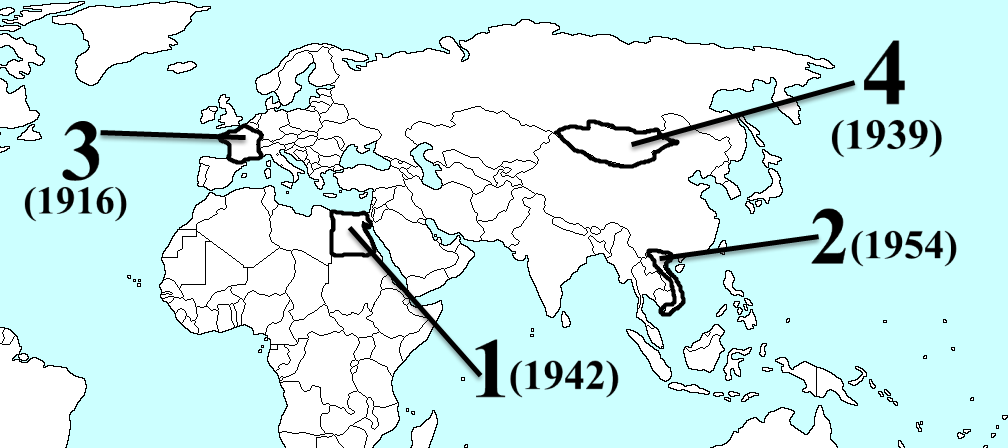 а) «Учение Маркса всесильно, потому что оно верно». б) «…Дайте Государству 20 лет покоя, внутреннего и внешнего, и вы не узнаете нынешней России». в) «…Правильно было сказано, что демократия – наихудшая форма правления, за исключением всех остальных, которые пробовались время от времени». г) «Не важно, чёрная кошка или белая кошка, если она может ловить мышей – это хорошая кошка». д) «Пусть расцветают сто цветов, пусть соревнуются сто учений». Ответ: ____________ Баллов)Перед тобой карта. На ней цифрами отмечены современные государства. В скобках рядом с номерами стран приведены годы значимых битв и сражений 20 века, произошедших на их территории. Определи, на территории какого государства произошло то или иное сражение. Ответ запиши в строчку без каких-либо знаков препинания и пробелов, где буква названия сражения будет соответствовать порядковому номеру страны на карте. Например, абвг