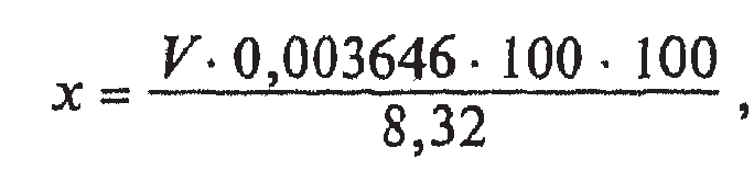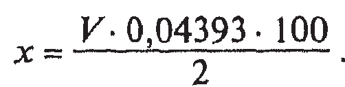 где 0,003646 — титр 0,1 н. раствора хлористого водорода; 8,3 — содержание хлористого водорода в разведенной кислоте хлористоводородной, %. Можно в расчетах использовать коэффициент для пересчета непосредственно на разведенную кислоту хло- роводородную, равный: тогда: Натрия хлорид и кислота хлороводородная. Оттитрованный раствор переносят в мерную колбу вместимостью 50 мл и доводят объем до метки водой. К 10 мл полученного раствора прибавляют еще 1 каплю раствора бромфенолового синего и титруют 0,1 н. раствором серебра нитрата сумму хлоридов (V{ мл). Содержание натрия хлорида в процентах (xj) рассчитывают по формуле: