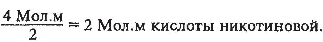 Описание. Таблетки белого цвета, без запаха. Подлинность. 0,5г порошка растертых таблеток растворяют в 10 мл воды, нагретой до 70—80 °С, и фильтруют. К 3 мл теплого фильтрата прибавляют 1 мл раствора меди ацетата; выпадает осадок синего цвета (карбоксильная группа). К 5 мл того же фильтрата прибавляют 0,5 мл раствора меди сульфата и 2 мл раствора аммония роданида; появляется зеленое окрашивание (карбоксильная группа). К 1 мл того же фильтрата прибавляют 5 мл воды, 1 мл полученного раствора помещают в мерную колбу вместимостью 100 мл, доводят объем раствора водой до метки и перемешивают. Значение оптической плотности при длине волны 262 нм должно быть не менее 0,35 и не более 0,39. Количественное определение проводится йодометри-ческим методом. Вначале навеску растертых таблеток нейтрализуют раствором гидроксида натрия по фенолфталеину, а затем прибавляют пипеткой точный объем 5 % раствора меди сульфата. Осадок меди никотината отфильтровывают, а в части фильтрата определяют остаток меди сульфата. Для этого к аликвоте фильтрата прибавляют разведенную кислоту хлороводородную, калия йодид и выделившийся йод титруют 0,1 н. раствором натрия тиосульфата. Одновременно проводят контрольный опыт. В основе количественного определения кислоты никотиновой лежат следующие реакции: