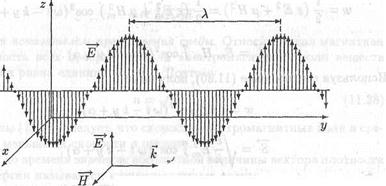 Рассмотрим плоскую гармоническую электромагнитную волну, которая описывается функциями (11.24), (11.25), (11.28), (11.29) и (11.31). Согласно этим формулам векторы Е и H имеют следующие проекции на координатные оси: Ex=0, Eу = 0, Ez(t,y)=Emcos(ωt-ky+a) Hx(t,y) = Hmcos(ωt-ky + a), Ну=0, Hz = 0. (11.33) Эти функции описывают распространяющуюся вдоль оси у плоскую гармоническую электромагнитную волну, в которой вектор Е всегда направлен вдоль оси z, а вектор H - вдоль оси х (рис. 11.4). Такая волна называется плоско, или линейно поляризованной. На рис. 11.4 показан один из лучей. Фазовые плоскости в данном случае параллельны плоскости ху. На фазовой плоскости векторы Е и H всюду одинаковы. Они изменяются только вдоль луча. Как видно в этом примере, векторы Е, Н и волновой вектор к в любой точке пространства взаимно перпендикулярны и образуют правую тройку. Это общее свойство электромагнитных волн. Как уже говорилось, электромагнитные волны являются поперечными, т.е. векторы Е и H ортогональны к лучу, вдоль которого распространяется волна. Соотношение (11.30), связывающее модули этих векторов, также выполняется для электромагнитных волн любой формы.