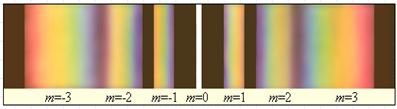 Рисунок 3.6. Разложение белого света в спектр с помощью дифракционной решетки. С помощью дифракционной решетки можно производить очень точные измерения длины волны. Если период d решетки известен, то определение длины сводится к измерению угла θm, соответствующего направлению на выбранную линию в спектре m -го порядка. На практике обычно используются спектры 1-го или 2-го порядков. Если в спектре исследуемого излучения имеются две спектральные линии с длиной волн λ1 и λ2, то решетка в каждом спектральном порядке (кроме m = 0) может отделить одну волну от другой. Одной из важнейших характеристик дифракционной решетки является ее разрешающая способность, характеризующая возможность разделения с помощью данной решетки двух близких спектральных линий с длинами волн λ и λ + Δλ. Спектральной разрешающей способностью R называется отношение длины волны λ к минимальному возможному значению Δλ, то есть