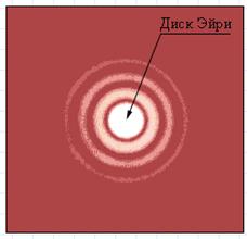 Рисунок 3.2 Дифракционное изображение точечного источника (дифракция на круглом отверстии). В центральное пятно попадает приблизительно 85 % энергии света. Размер дифракционных изображений очень мал. Например, радиус центрального светлого пятна в фокальной плоскости линзы диаметром D=5см с фокусным расстоянием F=50см в монохроматическом свете с длиной волны λ = 500 нм приблизительно равен 0,006 мм. Во многих оптических устройствах (фотоаппараты, проекторы и т. д.) дифракционное размытие изображений маскируется значительно более сильными искажениями из-за несовершенства оптики. Но в высокоточных астрономических приборах реализуется дифракционный предел качества изображений. Вследствие дифракционного размытия изображения двух близких точек объекта могут оказаться, неотличимы от изображения одной точки. Рассмотрим в качестве примера объектив астрономического телескопа, нацеленного на две близкие звезды, находящиеся на угловом расстоянии ψ друг от друга. Предполагается, что все дефекты и аберрации устранены, и в фокальной плоскости объектива наблюдаются дифракционные изображения звезд (рис.3.3).