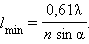 Здесь λ – длина волны, n – показатель преломления иммерсионной жидкости, α – так называемый апертурный угол (рис. 3.7). Величина nsinα называется числовой апертурой. У хороших микроскопов апертурный угол α близок к своему пределу: α≈π/2. Как видно из формулы Гельмгольца, применение иммерсии несколько улучшает предел разрешения. Полагая для оценок sinα≈1, n≈1,5, получим: lmin ≈0,4λ. Таким образом, с помощью микроскопа принципиально невозможно рассмотреть какие-либо детали, размер которых значительно меньше длины волны света. Волновые свойства света определяют предел качества изображения объекта, полученного с помощью любой оптической системы.