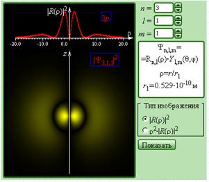Боровских орбит в атоме в действительности не существует. В каждом состоянии может быть указано только распределение вероятности нахождения электрона на различных расстояниях от ядра, которое называют электронным облаком. Наряду с функцией |Ψ|2 графически удобно изображать функцию r2|Ψ|2, которая пропорциональна вероятности нахождения электрона в сферическом слое радиуса r единичной толщины. Компьютерная модель предназначена для иллюстрации строгого решения задачи о состояниях атома водорода при значениях главного квантового числа n = 1, 2 и 3. При графическом изображении радиальных распределений вероятности удобно в качестве переменной величины использовать безразмерное отношение ρ = r / r1, где r1 = 5,29·10–11 м – радиус первой боровской орбиты. В верхней части экрана высвечиваются радиальные распределения |R(ρ)|2 или ρ2|R(ρ)|2, где функция R является радиальной частью волновой функции Ψ. ρ2|R(ρ)|2 плотность вероятности нахождения электрона на расстоянии r от ядра. В нижней части экрана воспроизводится для заданных значений квантовых чисел n, l, m пространственное распределение вероятности |Ψ(r, θ, φ)|2 (электронное облако). Изменяя значения n, l, m, следует кликнуть мышью на клавишу «показать» и пронаблюдать за изменениями радиального распределения вероятности (волновой функции) – электронного облака.