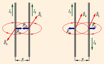 Если положить I = 1 А, l = 1 м, α = 90º, то B = F. Отсюда вытекает физический смысл В. Магнитной индукцией В называется физическая величина, численно равная силе, с которой магнитное поле действует на прямой проводник единичной длины с током единичной силы, расположенный перпендикулярно к силовым линиям магнитного поля. Единица измерения магнитной индукции: [B] = Н/А·м = Тл (тесла). Теперь становится понятным, почему два проводника с током притягиваются или отталкиваются: в зависимости от направления токов магнитное поле одного проводника выталкивает или втягивает другой проводник с током.