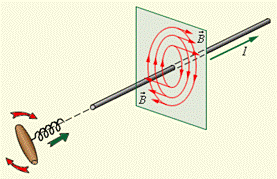 Из опытов было установлено, что на проводник со стороны магнитного поля действует сила (сила Ампера) F = I l B sinα, где α – угол между проводником и направлением магнитного поля. Направление силы можно определить по правилу левой руки (если четыре пальца расположить по направлению тока, а силовые линии магнитного поля будут входить в ладонь, то отогнутый большой палец покажет направление силы). Если угол α между направлениями вектора В и тока в проводнике отличен от 90°, то для определения направления силы более удобно пользоваться правилом буравчика: воображаемый буравчик располагается перпендикулярно плоскости, содержащей вектор В и проводник с током, затем его рукоятка поворачивается от направления тока к направлению вектора В. Поступательное перемещение буравчика будет показывать направление силы. Правило буравчика часто называют правилом правого винта.