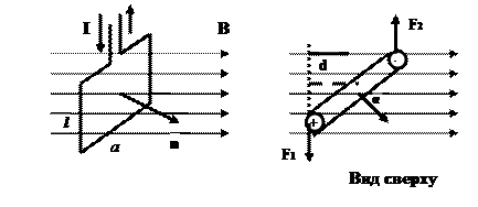 При протекании тока по проводнику на каждую его сторону действует сила со стороны магнитного поля. На верхнюю и нижнюю стороны действуют растягивающие контур силы. На боковые стороны действуют силы F1 = F2 = IB l sin90º, где l - длина боковой стороны. Каждая из этих сил создает вращающий момент М = Fd, где d – плечо силы. Момент пары сил М = 2Fd.= 2IB l d. Из рис.5.10 видно, что M = pmBsinα Вращающий момент перестает действовать, когда магнитный момент контура с током ориентирован вдоль направления магнитной индукции поля.